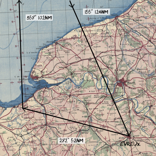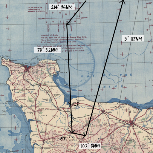 И ещё, при использовании магнитного компаса учитывайте магнитное склонение. на конец Мая 1944 г. на аэродроме вылета оно составляет 9.7° W Т.е. магнитный компасс показывает почти на 10° больше относительно истинного направления.