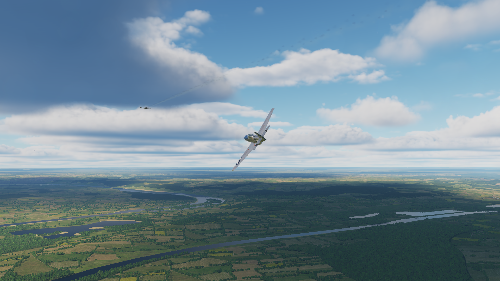 Взлетели в составе 12 Мустангов, 3 бота по пути решили заняться своими делами, поэтому вышли в район цели в количестве 9 Мустангов. Встретили над облаками 2 четверки мессов и фок, подбил один мессер. Собрались на обратном пути с Кортиком, безрезультатно провели поиск автоколонн и вернулись на базу. Летали долго, помимо подвесных баков, левый основной почти в 0, правый - 50%. Посадка штатно.