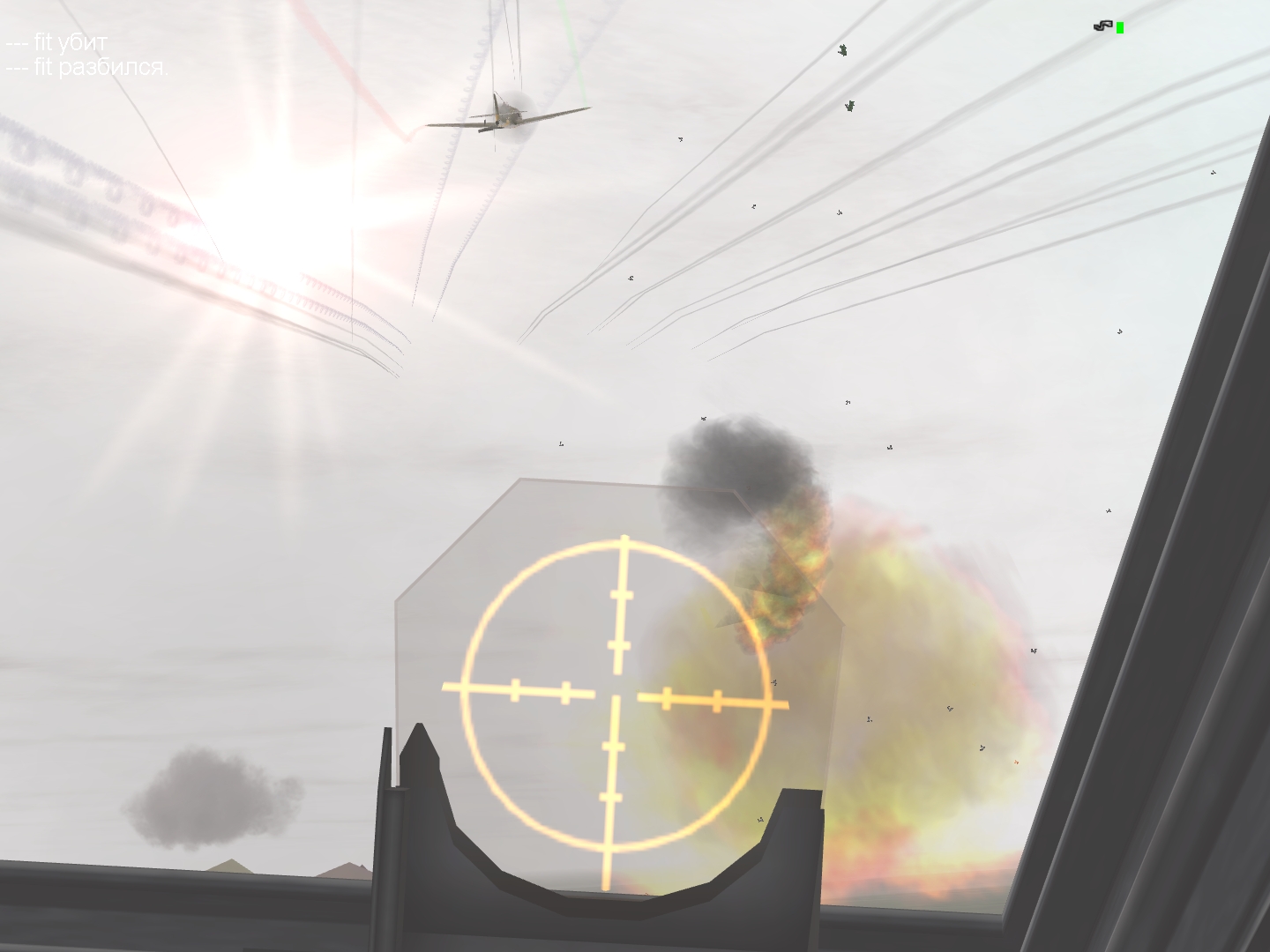 В первом вылете все было изумительно. Мы спустились вниз и я умер, услышав тяф-тяф. Во втором вылете мы с Фенрицем осуществляли прикрытие девятки юнкерсов. Вдвоем. Остальных мы потеряли, а когда нашли - это оказались яки. Один. Он обманул меня и убил Фенрица. Потом я решил отомстить и оторвал яку крыло. На отходе к дому встретил две новогодних фоки, они сопровождали двух кобр. Позади них ползли еще две гадюки. Я принял бой. Избежав обстрела убил одну из кобр. Затем принял участие в погоне, где сжег еще одну кобру, пилот которой выпрыгнул. По итогам второго вылета имею три сбитых. Требую две банки печенья и ящик варенья.