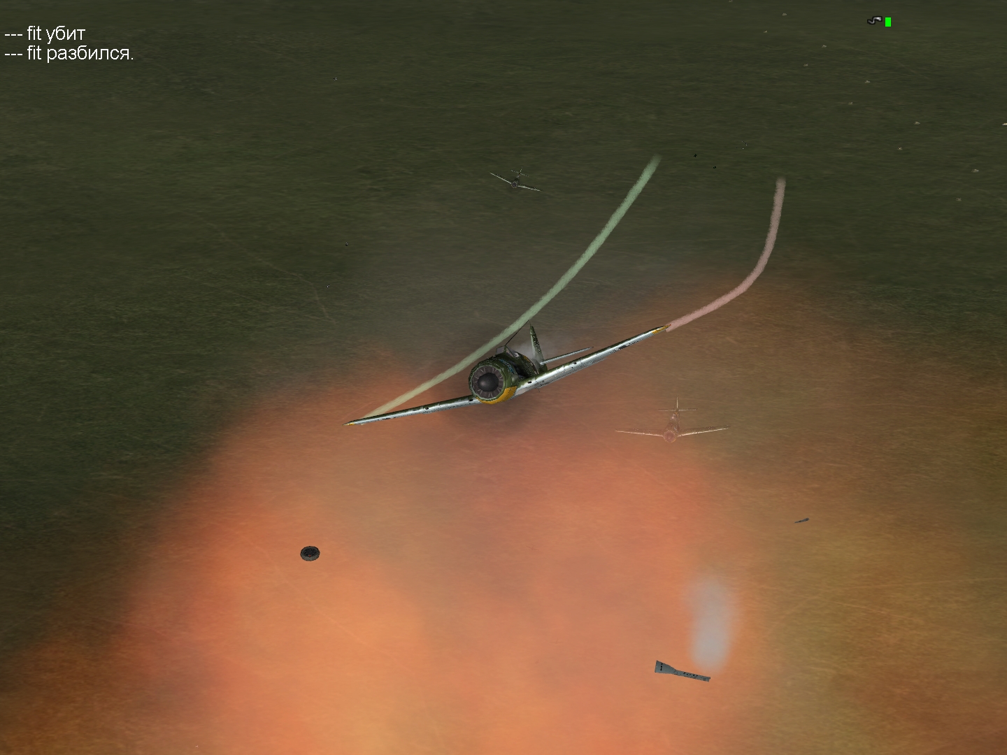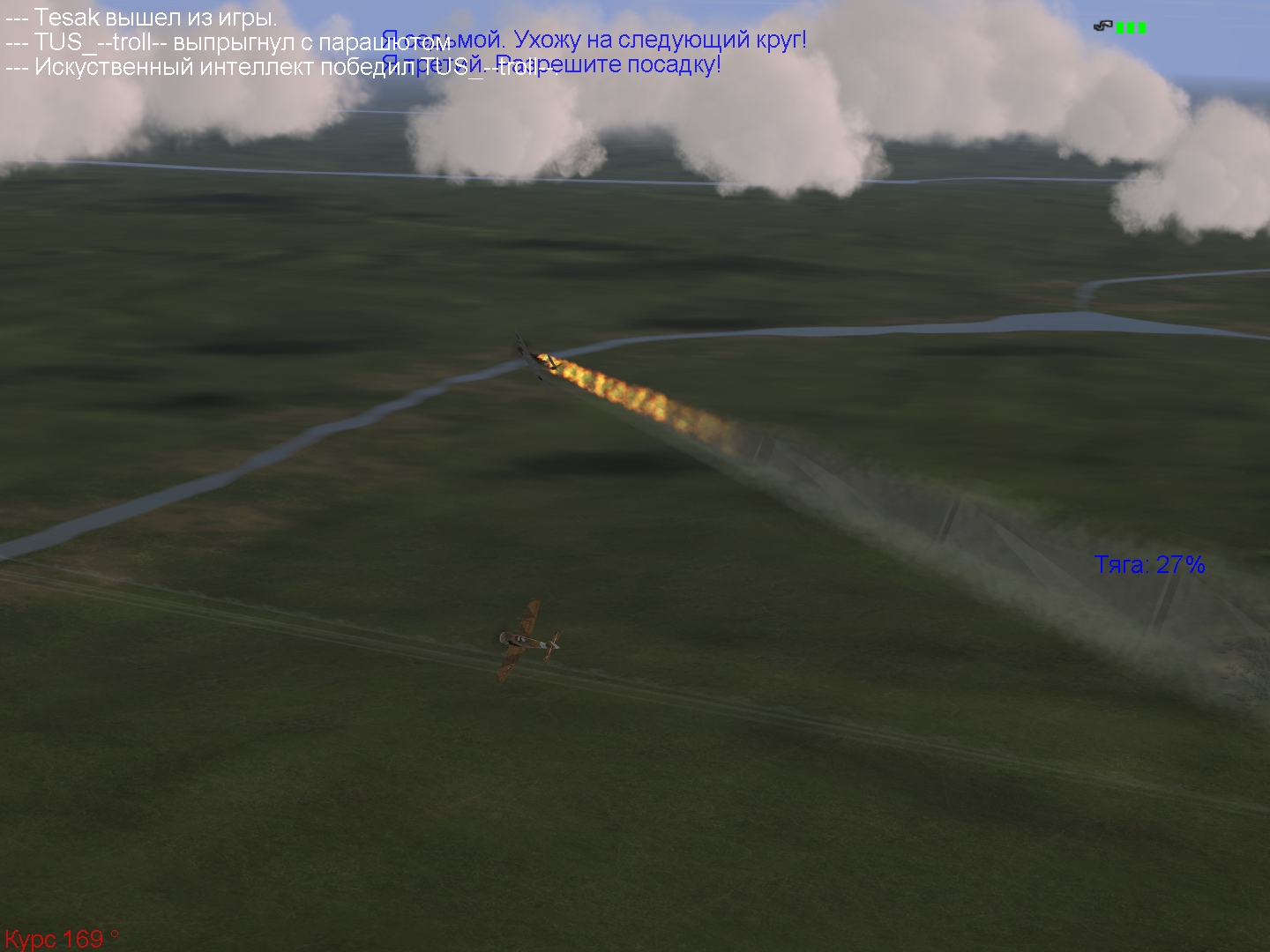 Бой угас, собираемся, я оказался рядом Кортиком. Опять много кого не досчитались... Тесака сбили, надо было за ним так и идти. Еще не было дня без потерь Уходим на базу. Как отработали Ю-88 не видел, зато видел 2 ихних экипажа на парашютах в районе линии фронта... и еще один уже на нашей территории в I-13, там же чуть севернее прямо под нами сел Ромео. И тут сообщают, что южнее нас кобры - разворачиваемся, идем на помощь. Сначало я подумал, что кобра всего одна, к тому же пробитая, но увидел еще одну, первую уже брали в оборот - думаю, сейчас этой гадюке не до меня, но не тут то было - хорошо вовремя Кортик предупредил(спасибо  ), но всеравно, нервы пощекотала основательно... с каждым громыханием её дрына, казалось, что вот - пришла и моя очередь... но тяну на себя изо всех сил, перекрутил, Кортик уже у неё на шести. Видел победу Яхмоса. Посадка удачная. Никого не сбил.