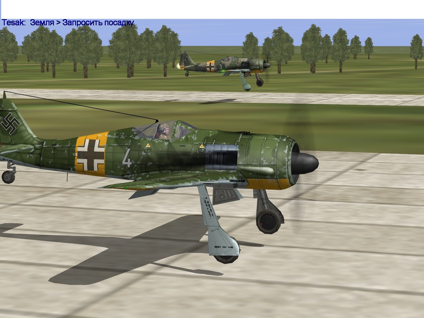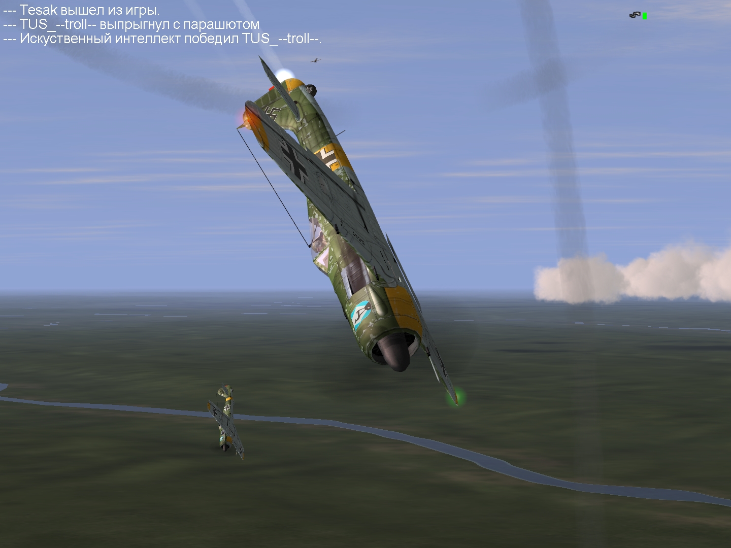 Второй вылет. Непосредственное прикрытие девяти юнкерсов выполнили образцово - почти все бомбардировщики отбомбились без помех. Но уже над самой целью сзади снизу вынырнули до десяти иванов. В горячке боя потерял ведущего. Уцепился за яком. Отогнал его от бомбардировщиков и сбил. Обернулся назад - увидел как фоккевульф 51х атакован еще одним яком. Поймал его в верхней точке, продырявил. За пару заходов основательно повредил его и стал собираться с оставшимися истребителями. Видел падение сбитого Троллом ивана. Пошел с Троллом парой домой где-то на двух с половиной. Над и13 увидели движущуюся встречным курсом пару кобр выше примерно на полторы тысячи. Потянули вверх, развернулись и стали догонять. Дошли до Тагино, догнать не получилось. Обнаружили сзади себя еще пару, которую атаковал африканец. Сделали заход на встречном курсе, разобрали с Троллом по цели и стали работать. Заметил у Тролла шесть, кричал, но иван отстрелил фоке крыло. Остался один двумя кобрами. Задымил одну. Выше слышал, как скрипел зубами африканец почти в такой же ситуации, как и моя. Хорошо, что подтянулись Коптук, Тесак и Ботсман. Оставил им дымящегося и пошел за верхними кобрами. Атаковал пару раз кобру, которую африканец своим скрежетом оглушил. Летела она как-то странно, оно и понятно, не каждый ариец выдержит такое нечеловеческое издевательство, что уж говорить об иванах. Пара заходов, выбитый радиатор, и у кобры встал двигатель. Добивать не стал, посчитал более эффективным повредить вторую кобру, пулеметами прошил ей крыло, ушел вверх и позволил африканцу сбить ее, ведь только благодаря его крепким зубам и стальным нервам я не остался один против четырех кобр.