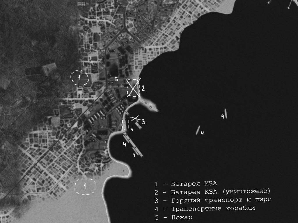 При повторной разведке(16:00) установлено: продолжаются пожары в порту, средний пирс по прежнему горит, у южного корабли на прежних местах, к северному пирсу чалится танкер, в гавани находится 2 эсминца и 4 транспорта, еще 2 эсминца выходят из порта.