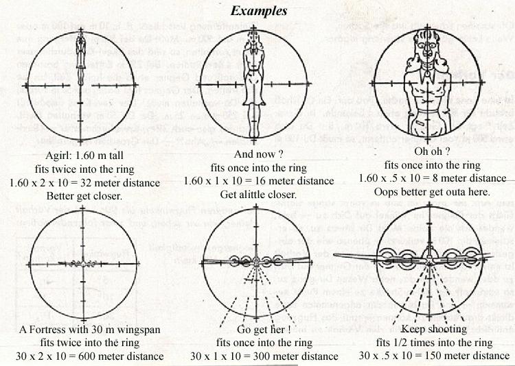 В бою неправильная оценка расстояния - вполне нормальное явление. Ваши глаза говорят, что Вы на расстоянии 100 метров – а на самом деле их порядка 200. Не верьте собственным глазам. Кольца прицела перед Вашим носом служат именно для оценки расстояний. Внешнее кольцо прицела рассчитано так, чтобы указывать 1/10 дистанции до цели. Всё просто, как Колумбово яйцо.