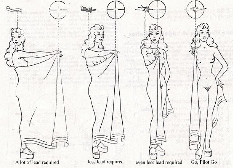 Итак, Вы вступили в бой, идёте на сближение с целью - ур-ря-а-а-а-а! Вот только куда целиться? Минутку! Мы учили это в школе снайперской стрельбы: угол сближения 30 градусов, скорость цели 400 км/ч - то есть упреждение от 1,5 до 2 колец прицела... теперь - курс цели... Вероятнее всего, к этому моменту Ваш самолёт разнесёт кто-нибудь с более быстрым умом, но есть и хорошая новость - у Вас есть достаточно времени, чтобы, болтаясь на парашюте, решить эту математическую проблему.