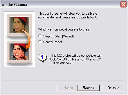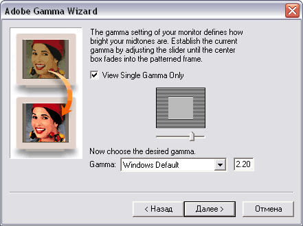 Шаг 4. Определение гаммы Это самый ответственный этап калибровки. Здесь устанавливается целевая гамма и выполняется визуальное уравнивание. Сначала следует определить какую целевую гамму (показатель степени функции описания тонопередачи) вы хотите получить. Строго говоря, это значение может быть любым. Считается, что для платформы Macintosh она составляет 1,8 а для платформы Windows 2,2. Собственная гамма среднестатистического монитора составляет порядка 2,5. Выберем, например, значение Windows Default 2,2. Теперь с помощью ползунка следует уравнять по яркости средний серый квадратик на фоне полосатого узора. Во время настройки следует двигать ползунок влево-вправо так, чтобы поле становилось то светлее, то темнее, постепенно уменьшая амплитуду движений. На заключительной стадии можно работать стрелками клавиатуры. Снимать опцию View Single Gamma Only для раздельного управления гаммой для каждого канала не рекомендуется. АХТУНГ!.Чтобы определить текущую гамму вашего монитора, перемещайте ползунок под образом с двумя серыми квадратиками. Добейтесь такого положения ползунка, при котором разница между внешним и внутренним квадратом минимальна. чтобы полоски на внешнем квадрате не мешали, отодвинтесь от монитора на метр-полтора.