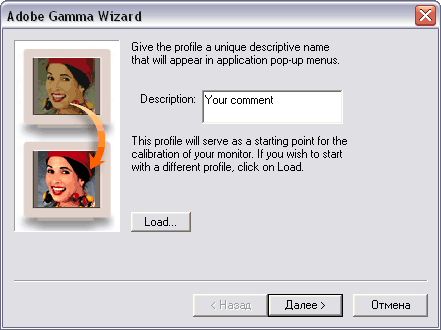 Шаг 1. Подгрузка начального профиля На первом этапе следует подгрузить профиль монитора, предлагаемый производителем, поскольку в нем содержится информация о цветностях люминофора. Если заводского профиля нет, то в качестве начального следует взять профиль цветового пространства sRGB. В поле Description следует ввести свой комментарий, чтобы иметь возможность убедиться, что калибровка прошла успешно.