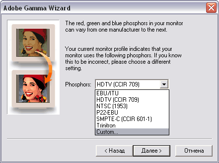 Шаг 3. Определение цветностей люминофора Этот этап предназначен для точного задания цветностей первичных цветов. Визуально это сделать невозможно, поэтому следует использовать информацию из заводского профиля или с сайта производителя. Если на первом этапе был подгружен заводской профиль, то на этом шаге не нужно ничего делать, а в поле Phosphors будет указано Custom (заданные пользователем). В крайнем случае, если вы не знаете, что выбрать, а провиля монитора нет, то выбирайте HDTV.