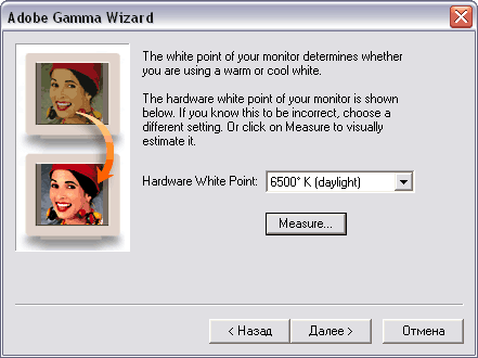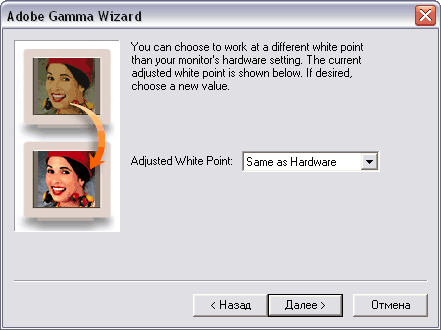 Шаг 6. Определение целевой точки белого Теоретически программа позволяет компенсировать точку белого до требуемого значения, если монитор сам не поддерживает соответствующую цветовую температуру. Но если попробовать выбирать разные значения, то вы увидите чудовищный результат. Использование этой функции катастрофически сужает цветовой охват, поэтому единственный правильный вариант – выбрать опцию Same as Hardware (та же, что и у монитора, т.е. не компенсировать).
