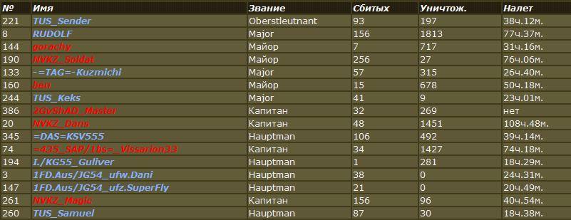 Сендер молодец - как залез на первое место оберстлейтенантом, так и сидел там всю войну Вобще на серваке полная синева кругом - и по раскладам крафтов и по квалификации пилотов. Может быть расклады были рассчитаны на то, чтобы после 43го года синим было сложнее, но война волшебным образом раньше закончилась и мстя красных стала невозможной. Хотя если бы мы зашли за красных, все могло быть совершенно иначе... Короче ТУЗы - молодцы!! Как всегда жжем =)