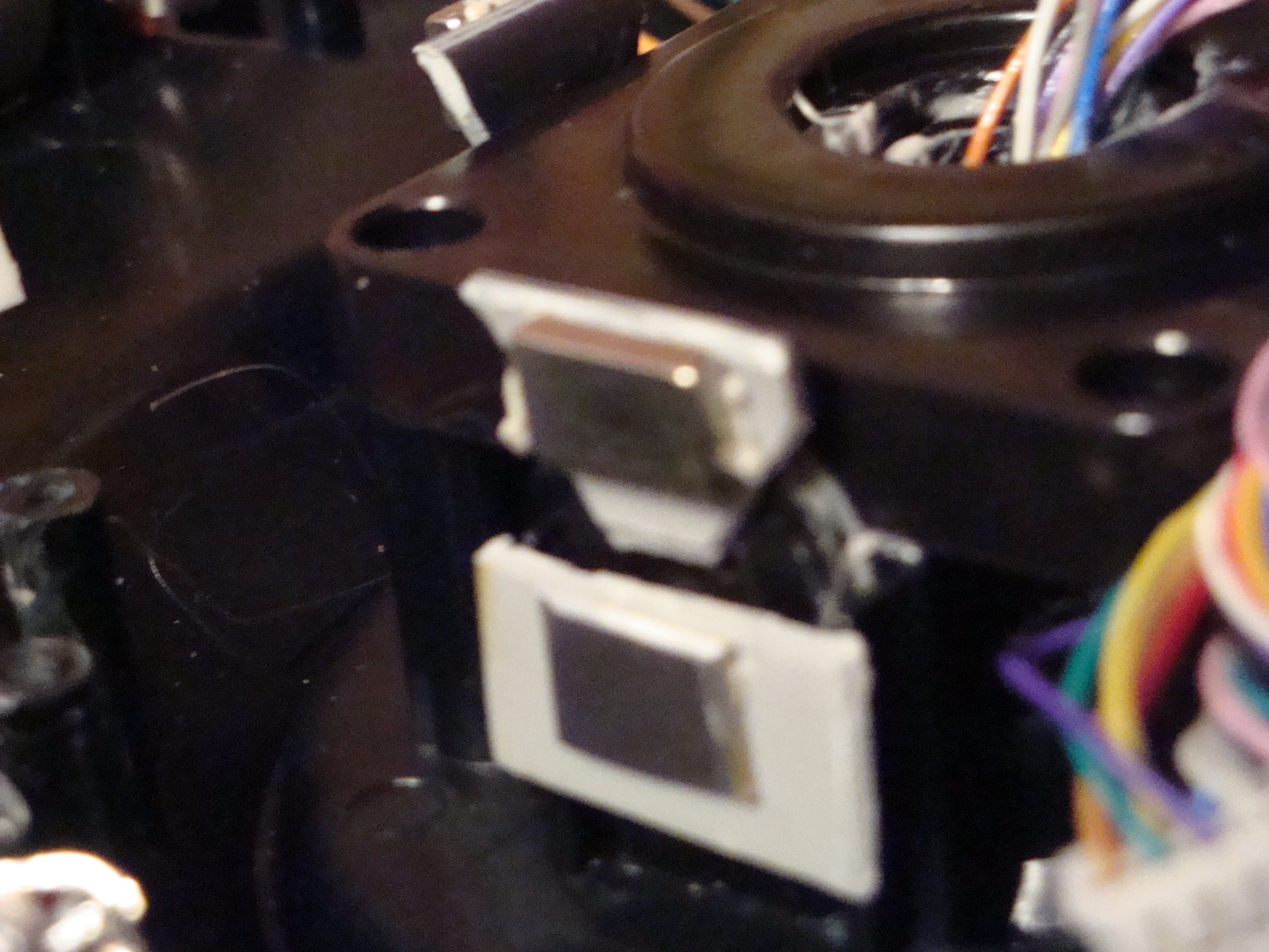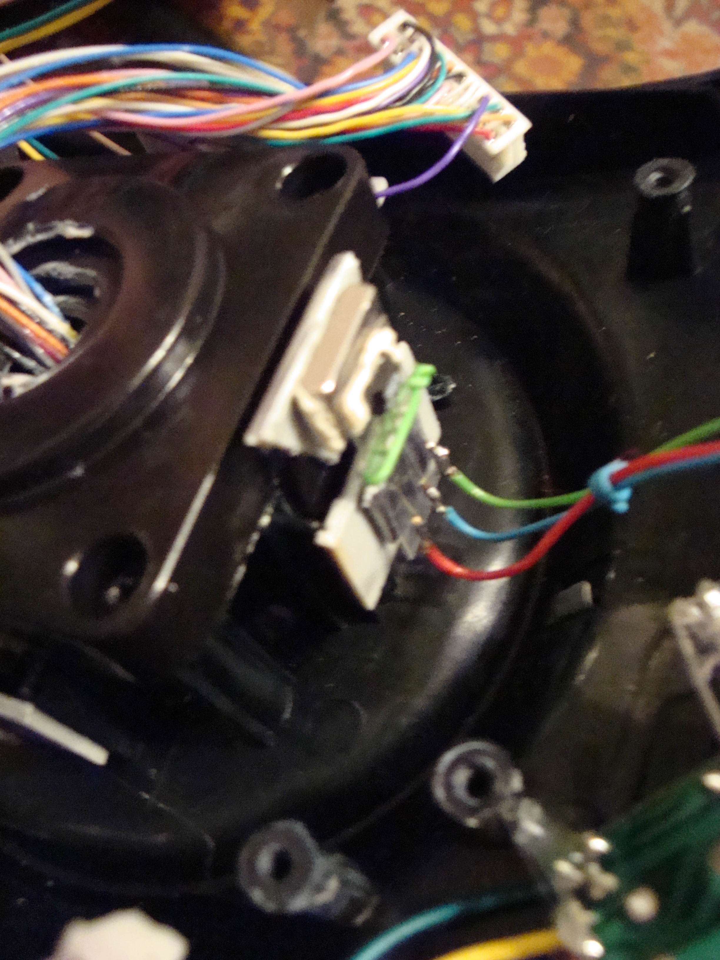 Комментарий к файлу: Пропатченная ева вид сверху. Плата держится на болтике в верхнем правом углу. Два оставшихся провода - синий и желтый (от светодиода в голове Евы) никуда не подцепил, т.к. уже было лень тянуться до питалова.
