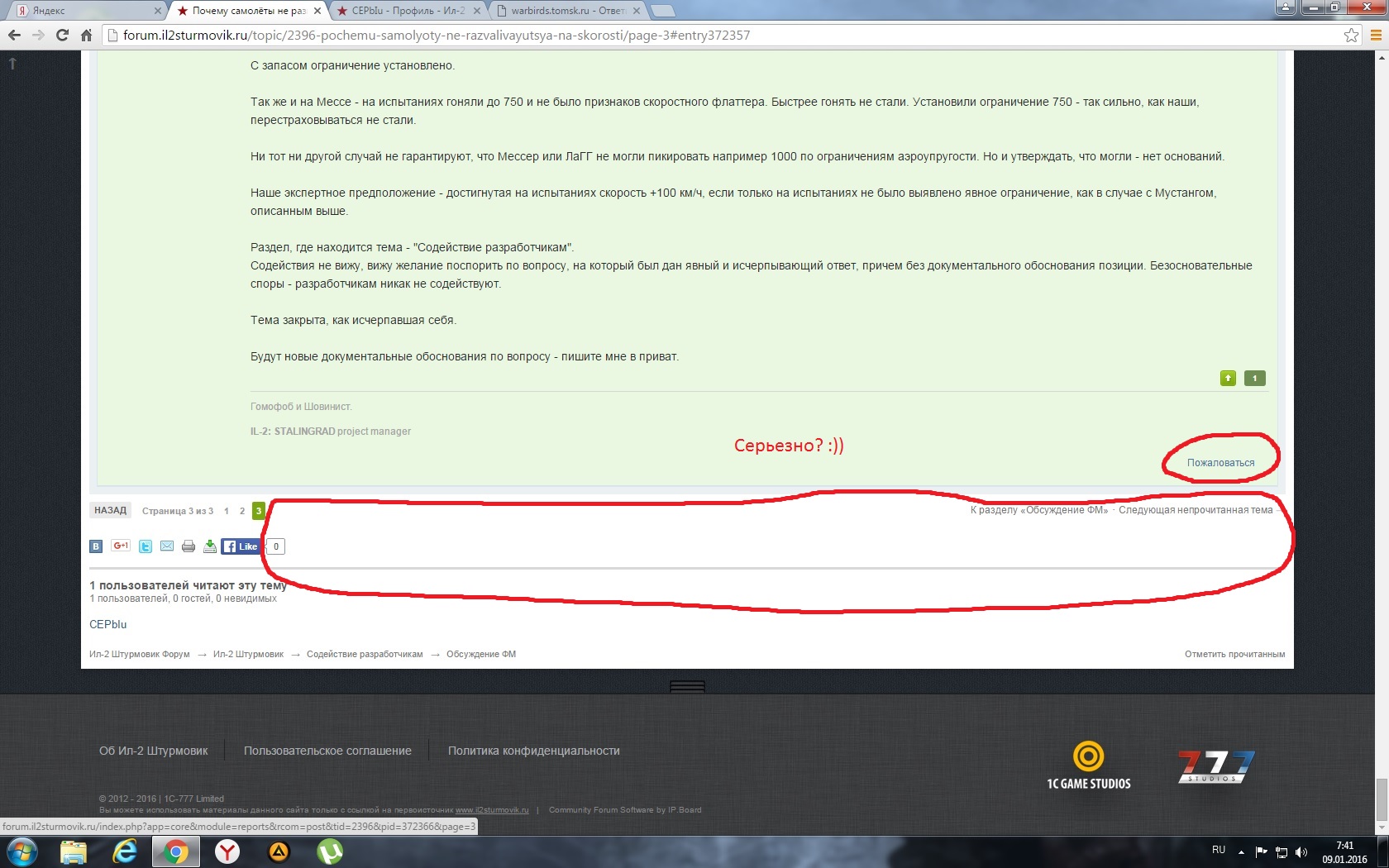 Смотрите-ка http://forum.il2sturmovik.ru/topic/2396 ... /?p=372209. Интересные дела. Вот что у нас происходит когда у разрабов заканчиваются аргументы. Они сами говорили что в приоритете при настройке техники какой-либо страны они буду руководствоваться документами этой страны а документы остальных стран использовать как дополнения. Они также говорили что документов по пикированию 109го у них нет, я им сам же дал этот отчет (только без перевода на английский), сам же его в последствии перевел, и что в итоге: товарищ Хан вопреки здравому смыслу продолжает стоять на своем. Кстати на каких таких испытаниях у него мессер на 750 разогнался и флаттера при этом не наблюдалось? Пусть покажет! PS Похоже покупка БзМ откладывается на неопределенный срок.