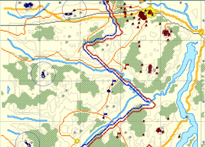 Предложение - может как-то рассредоточить эти машинки? Потому что - такой плотной колонной, даже в реале, они могли находиться только если они не будут двигаться (в нашем случае они ... как бы двигаются) поэтому есть предложение - растянуть их по дороге. То же самое я хочу сказать о танках в квадрате В-1. Я думаю, что их нужно не колонной ставить, а рассредоточить в квадрате. Вы вспомните все советские фильмы про войну - немцы не нападали танками по дороге. Они двигались на открытой местности вне дороги. И ставить их колонной - значит подвергать большой опасности!