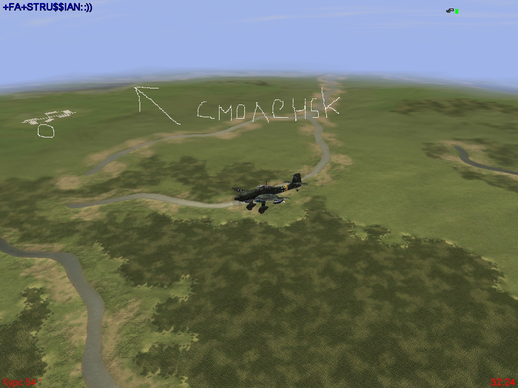 Ну вот значит поетел я бомбить Ярцево, вылетел из а15 летел на Штуке д3 с нагрузкой 1-500 2-250 топлива 100%. Долетев до линии фронта за 15 мин. курсом 90 шёл. набрал 4000., тут началось самое интересное, я заблудился, да мужики заплутал. Летел я по рекам и городкам, с высоты 4500 уже дороги трудно угледеть, да и опускаться рисковано, красных много, да и ещё Кожедуб летает.Вообщем взглянул 10 раз на карту, нихрена не понял, полетел курсом 120 лечу-лечу нихрена нет а время то летит (я знал что ето билет в один конец 40 мин мне нехватит чтоб туда и обратно) смотрю филд думаю блин откудо тут филду взяться у Ярцево то нет ничего только у Смоленска, а до туда как я мог долететь ??? ладно лечу уже курсом 120- 150 потомучто ориентироваться невозможно по рекам их там до...тут с земли какзастреляли 80 мляха муха повреждений нет лечу,у самого уже руки все потом облились. Вдали большое чёрное пятно и бетонный филд это же точно Смоленск - это жопа здесь столько красных сейчас. Вот один взлетел (смотри рисунок-1) кто ето Ла или Як не видно отсюда,может он меня тоже не видит. И тут я увидел Смоленск сколько тут всего у меня слюнки потекли жаль что я один и бомбы у меня всего три.Смотрим (рис.2) где1- вокзал 2А,Б- колонны.