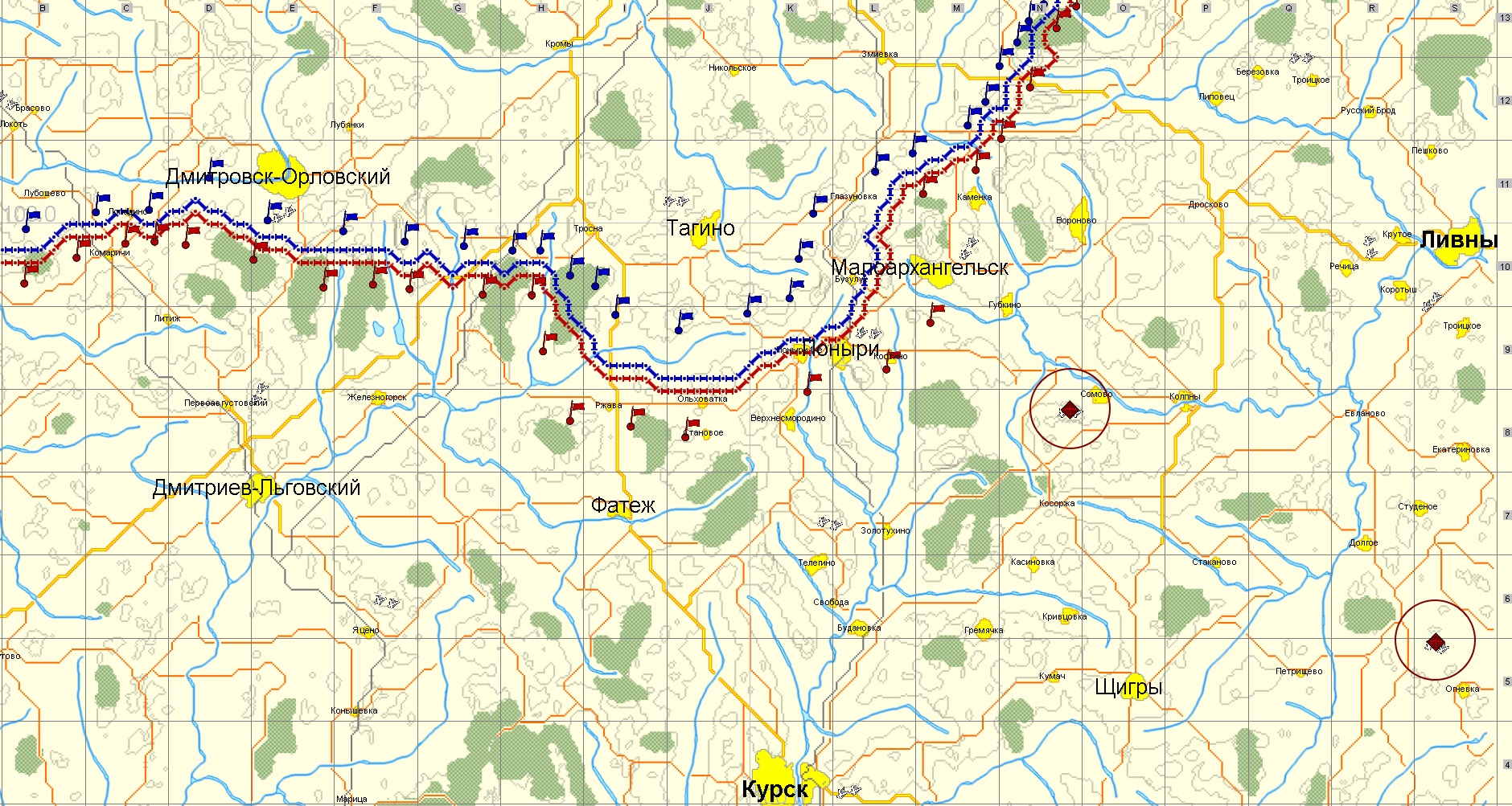 Наступление войск Центрального фронта планируется в северном направлении, в сторону Кром. Командование фронта приказывает бомбардировочной авиации в подготовительный период наступления наносить удары по Кромам и сооруженным в ее районе оборонительным сооружениям.