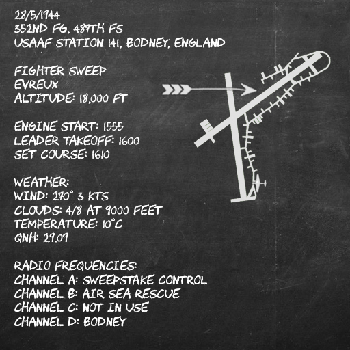 Задачу выполняют 8 мустангов 487й эскадрильи. Запускайте двигатель, свяжитесь с вышкой на канале D, вырулите на ВПП 35 и взлетайте в 05:10. После того, как вы окажетесь в воздухе, переключитесь на канал A и встаньте в круг над аэродромом на высоте 3000 футов до 05:10, чтобы дать возможность всем занять строй. Убедитесь, что вы израсходовали все топливо в фюзеляжном баке, прежде чем переходить на крыльевые, чтобы он был почти пустым в случае встречи с истребителями противника.