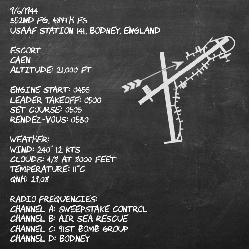 Сегодня вы будете сопровождать небольшой рейд на Кан и обратно. Его железнодорожные склады жизненно важны для немецкой армии в снабжении своей обороны. Этот рейд, вероятно, будет "молочным", поэтому мы посылаем только два звена. Воздушная активность противника в последнее время была очень низкой, мы не ожидаем никакого сопротивления. Взлет в 05:00, встреча с бомбардировщиками в 20 милях к северу от Гавра на высоте 21 000 футов в 05:30. КП Sweepstake будет информировать вас о ситуации по каналу А. Истребители сопровождения будут лететь в S-образных разворотах над и за строем бомбардировщиков. Transport Blue 4 будет слушать частоту бомбардировщиков на канале C.