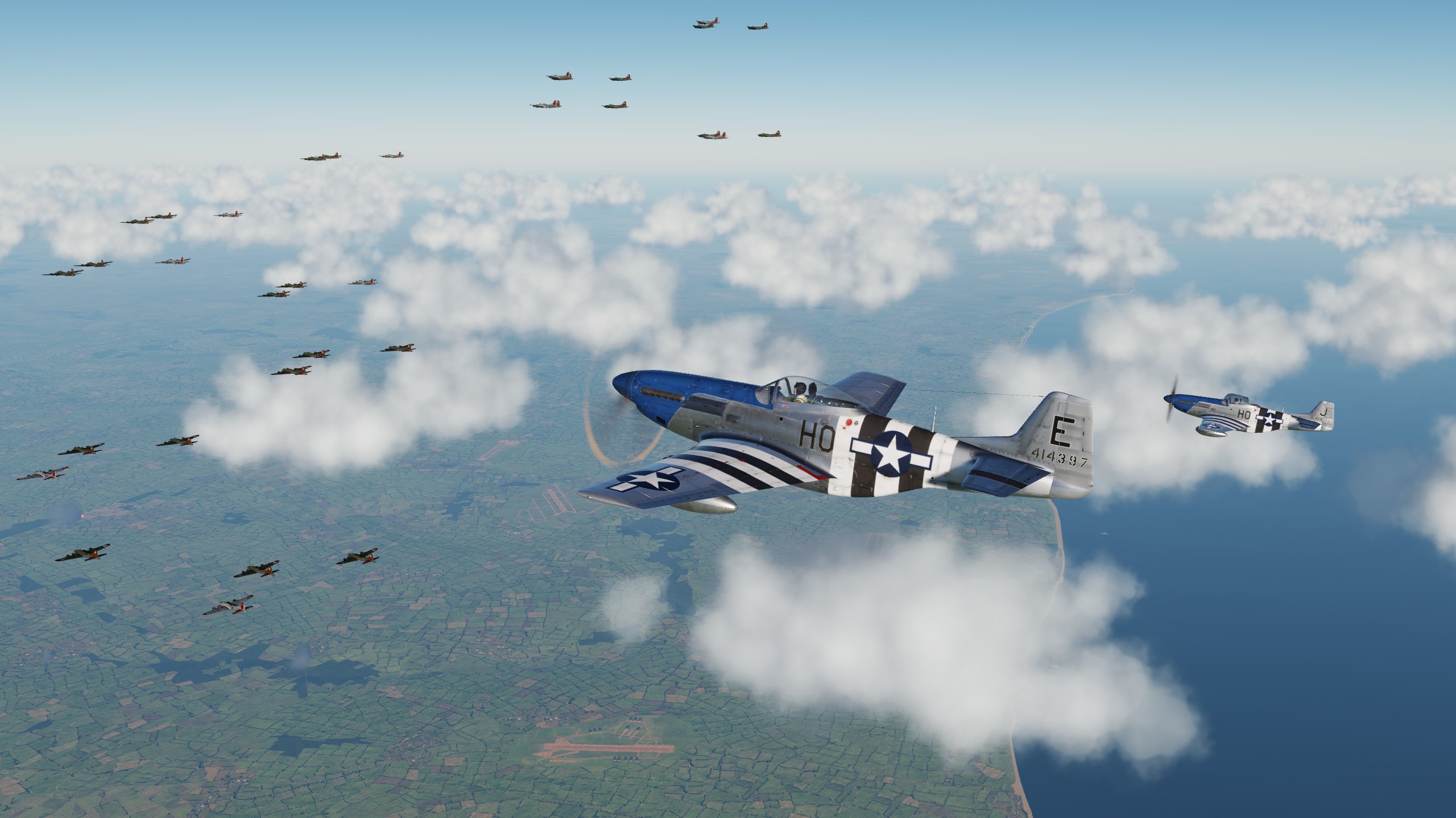 Задачу выполняют 8 Мустангов 487й эскадрильи. Запустите двигатель, свяжитесь с вышкой по каналу D, вырулите на полосу 23 и взлетите в 05:00. Как только вы подниметесь в воздух, переключитесь на канал A и встаньте круг над аэродромом на высоте 3000 футов до 05:05, пока все не займут строй. Убедитесь, что вы израсходовали все топливо в фюзеляжном баке, прежде чем переключиться на сбрасываемые баки, чтобы они были почти пустыми в случае столкновения с вражескими истребителями.