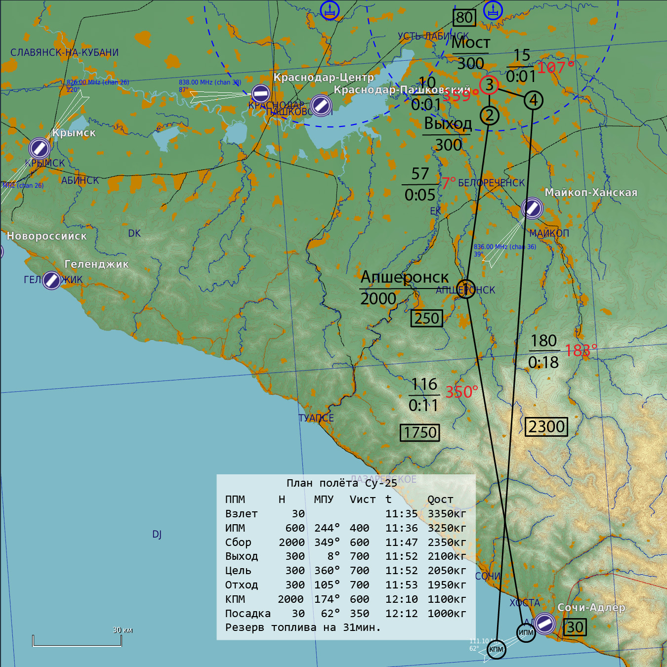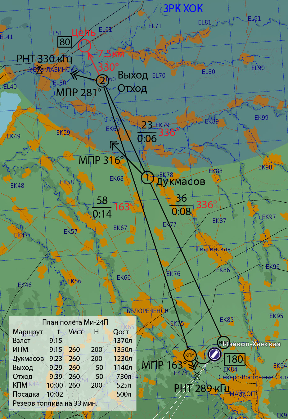 В интересах поставленной задачи два звена МиГ-23МЛД обеспечивает господство в воздухе в районе УСТЬ-ЛАБИНСКА с 9:35 до 9:55, звено Су-24М выполняют задачу по подавлению ПВО.