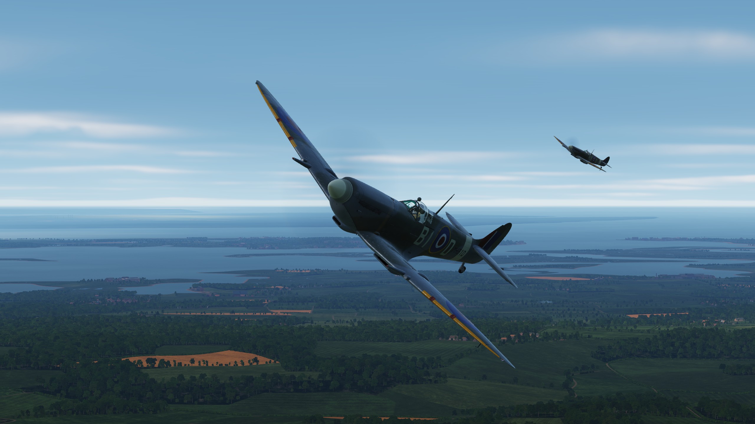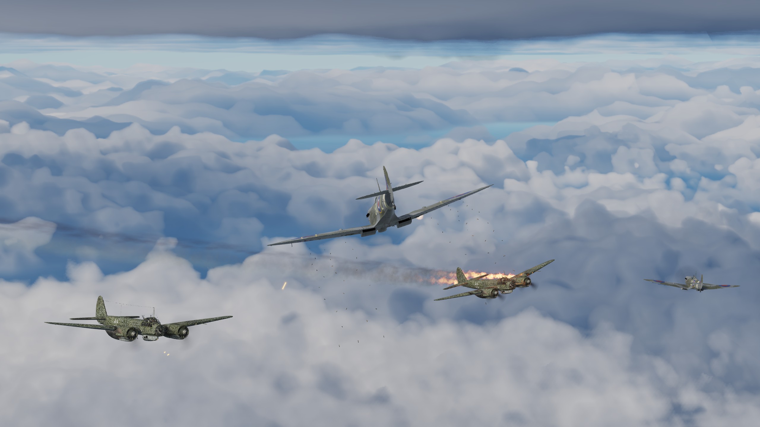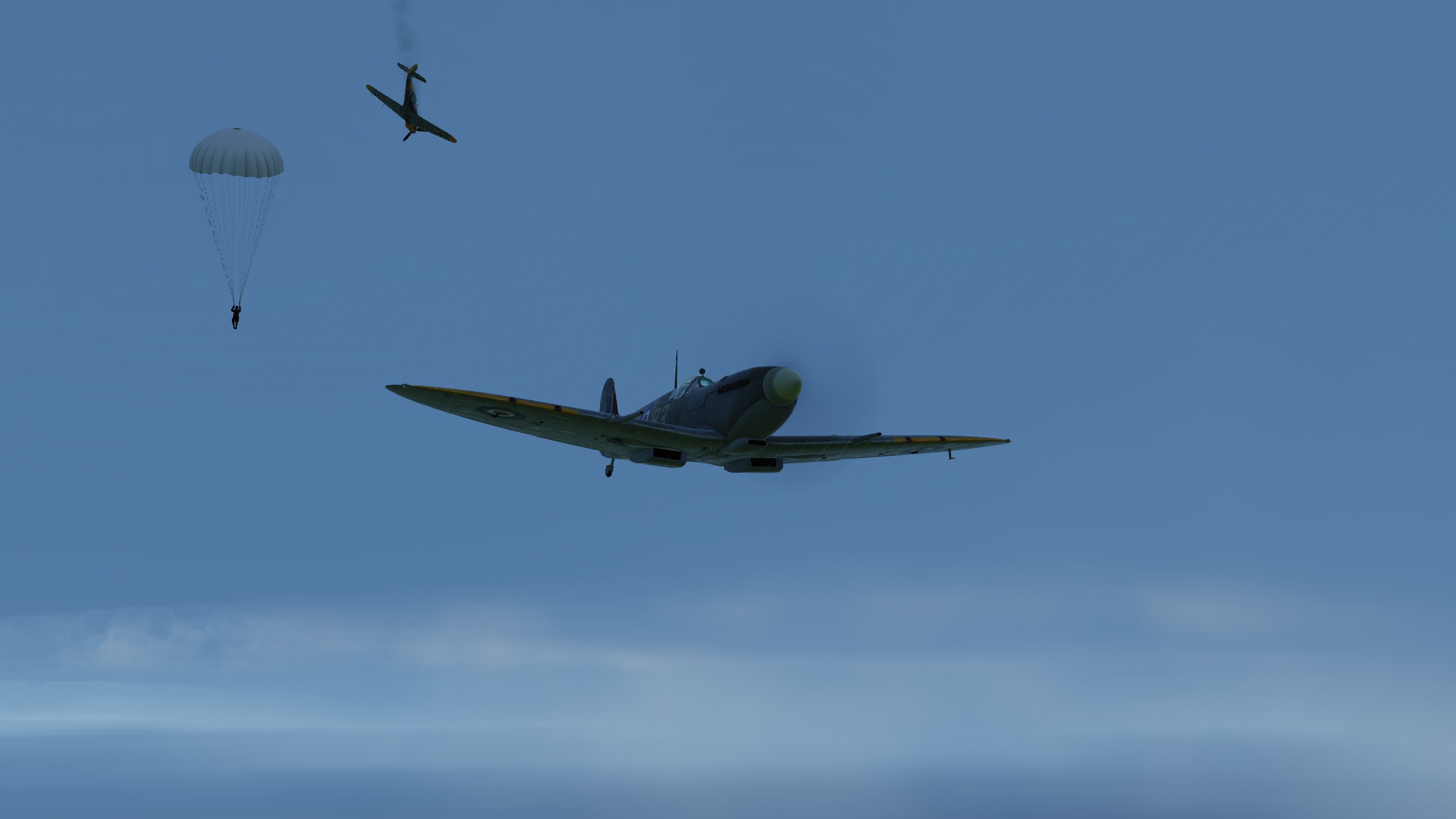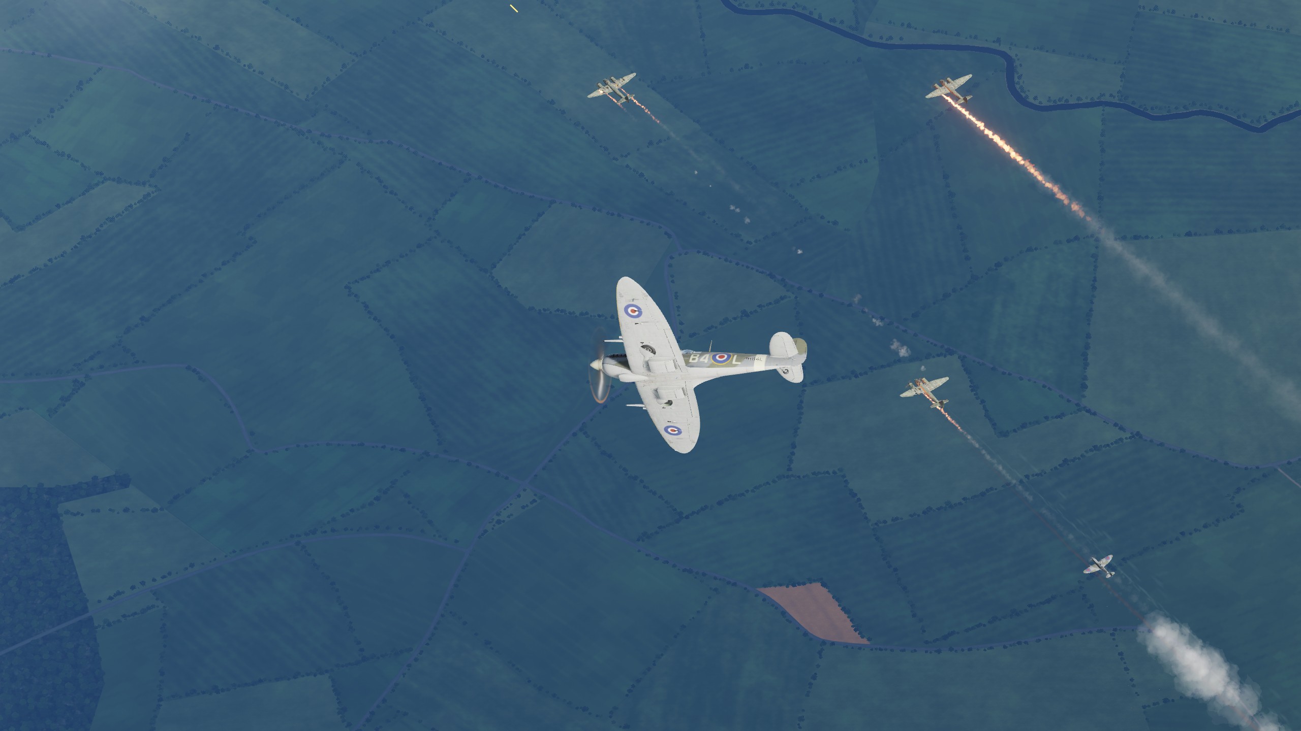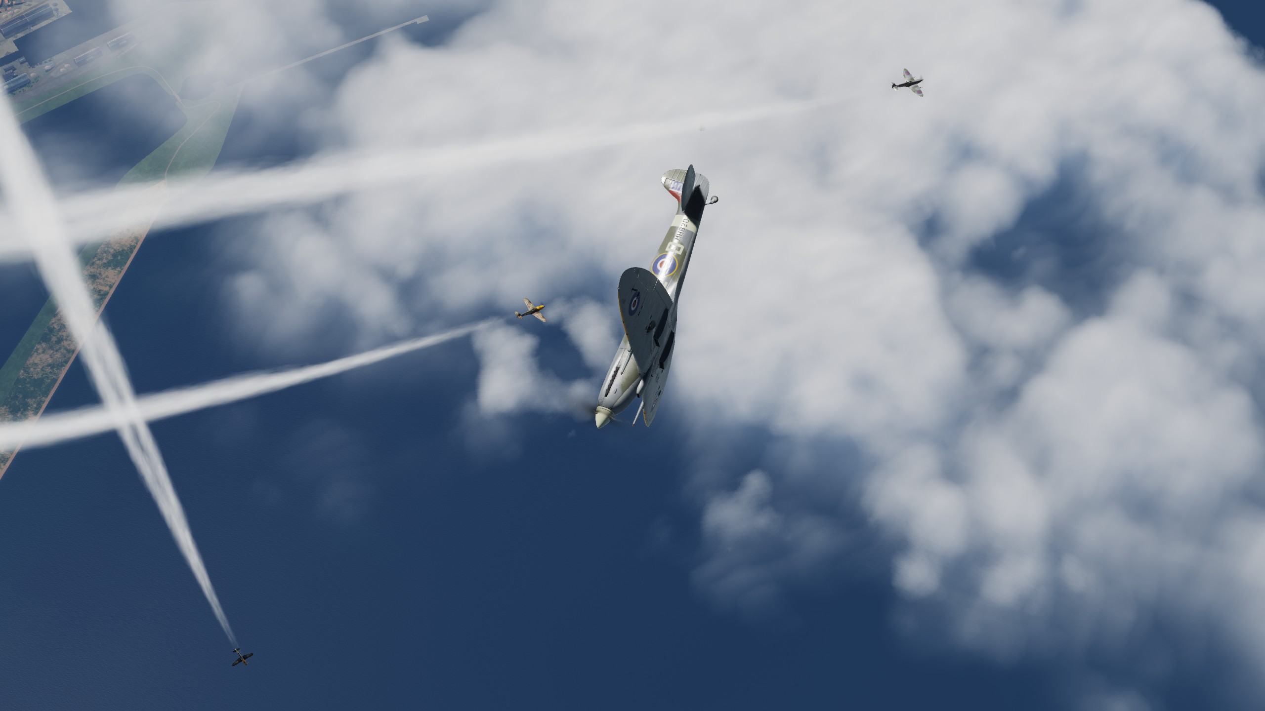 В составе "синего" звена спитфаеров совершил 3 боевых вылета ведущим второй пары. Из особенностей хочу отметить крайне неудовлетворительную видимость. То ли смог от наших заводов, поднявшийся на высоту, то ли еще что, но разглядеть кого-либо на фоне относительно чистого неба было крайне проблематично. По этой причине в первых двух вылетах потеря всех вокруг была обычным явлением.
