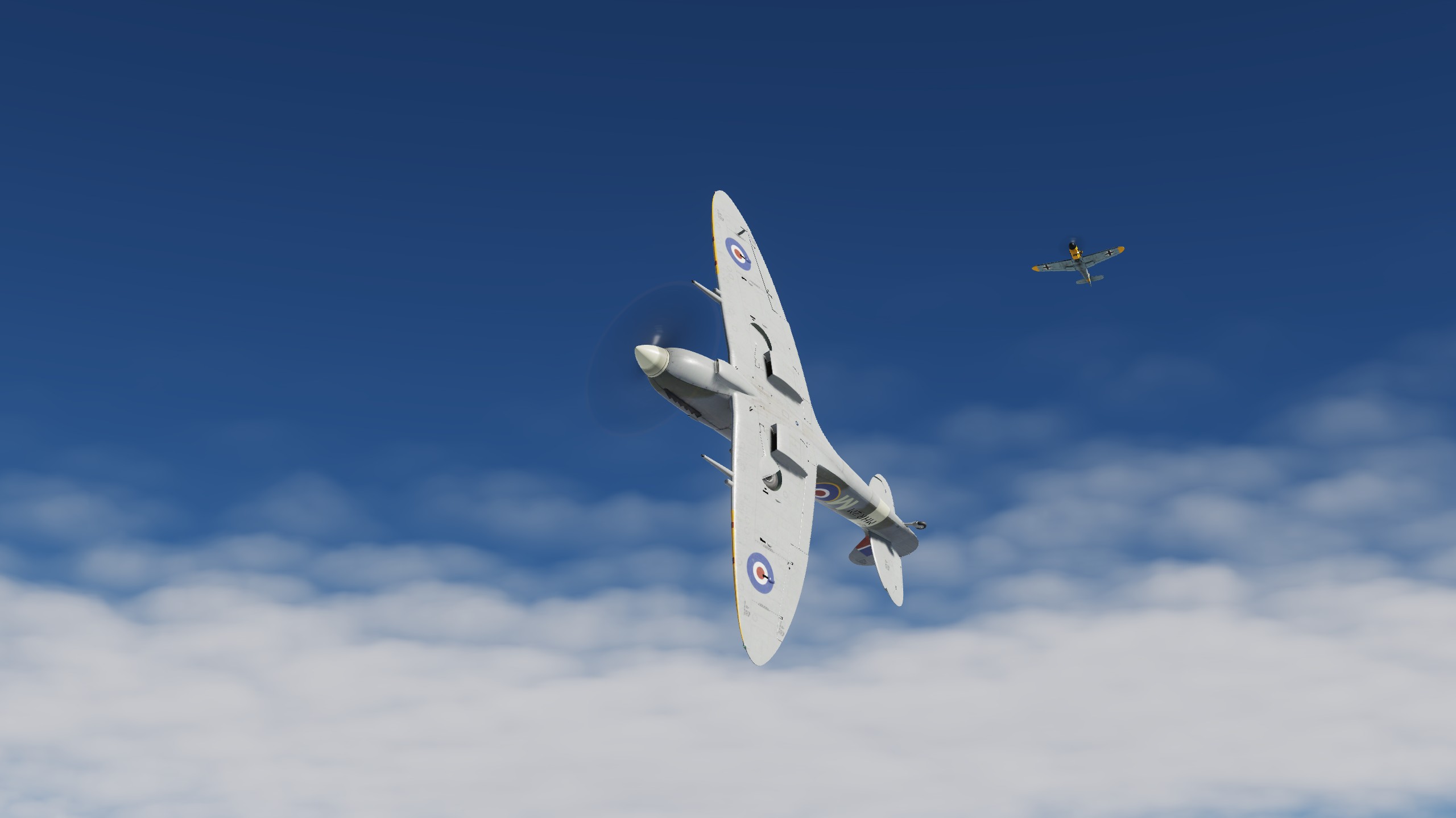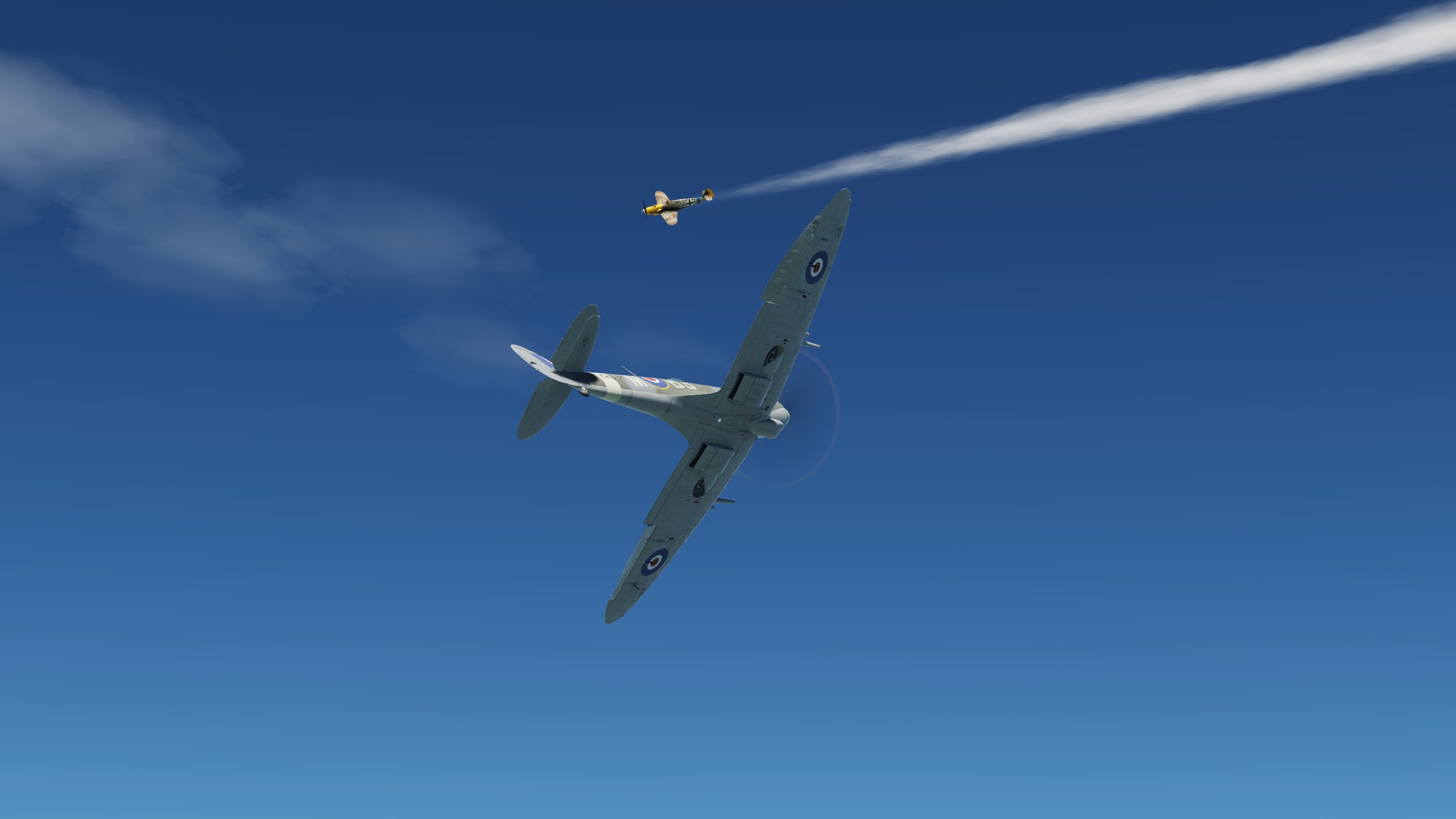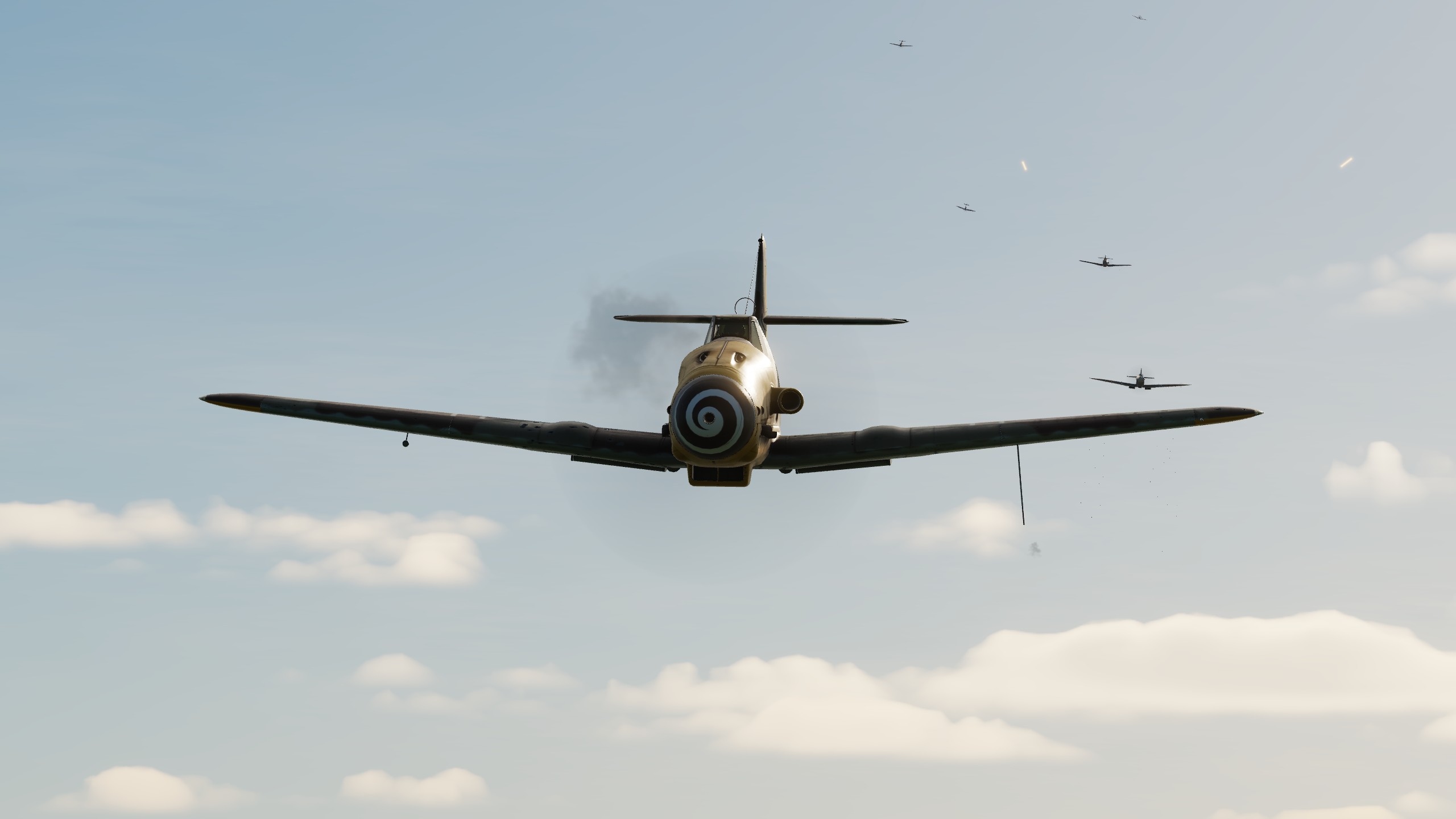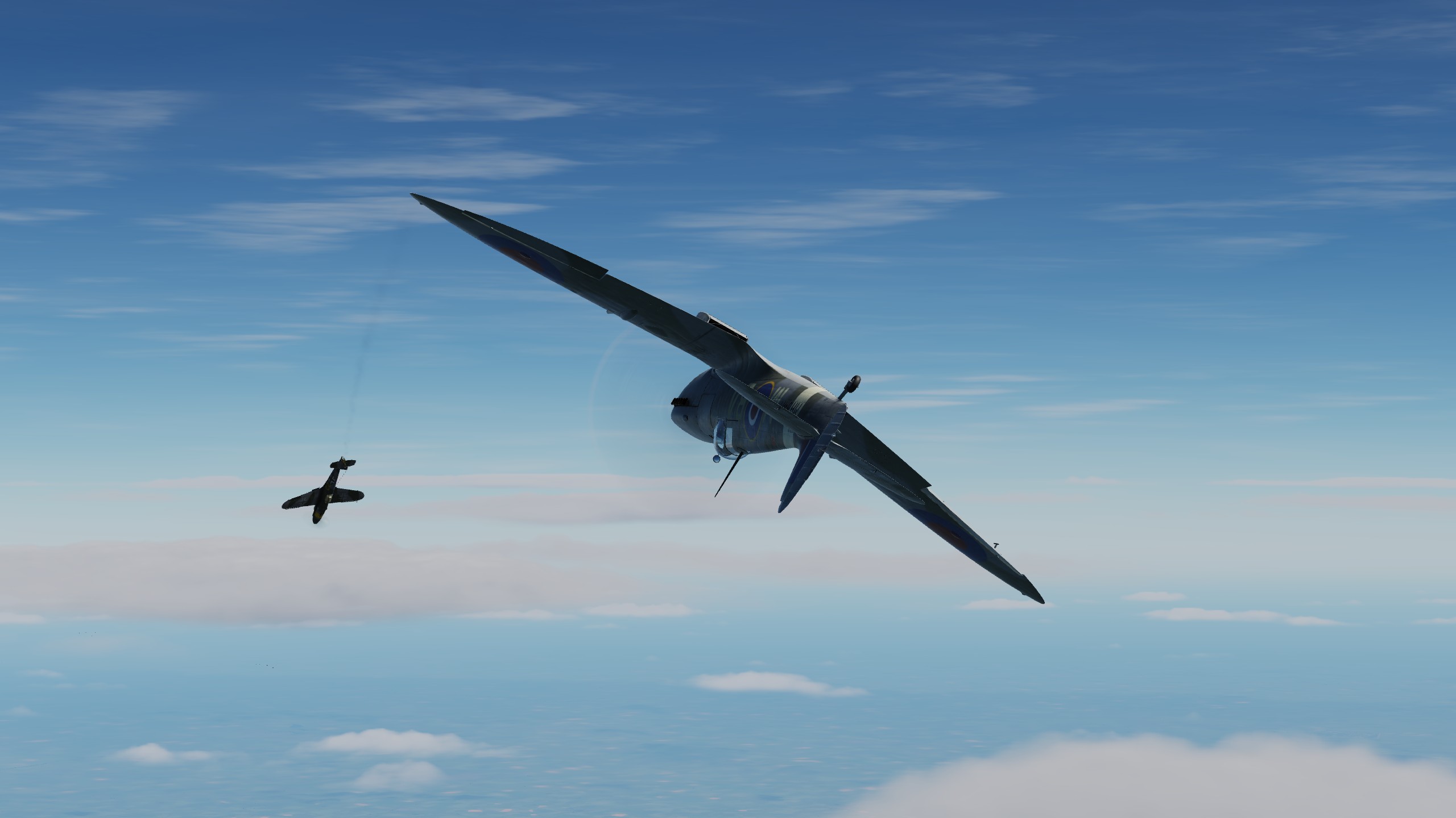 В составе "синего" звена спитфаеров совершил 3 боевых вылета ведущим второй пары. Из особенностей хочу отметить крайне неудовлетворительную видимость. То ли смог от наших заводов, поднявшийся на высоту, то ли еще что, но разглядеть кого-либо на фоне относительно чистого неба было крайне проблематично. По этой причине в первых двух вылетах потеря всех вокруг была обычным явлением.