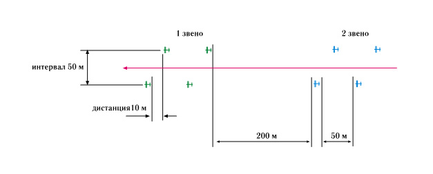 По этой команде каждая пара сохраняет свой строй (интервал 50 м, дист. 10 м)