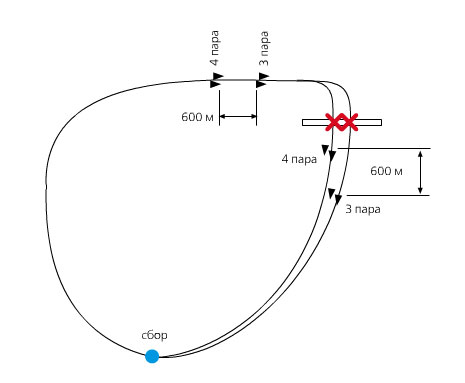 Пары выстраиваются в колонну с дистанцией 600 м.