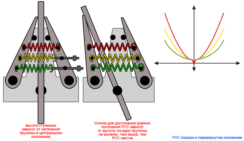Короче, такой вариант загрузки приемлем только для педалей, где ступенька нужна, чтобы ногами чувствовать центр. Для джоя - не годится. Для джоя единственный приемлимый вариант раздельной загрузки - две пары пружин вразнотяг, по паре на ось.