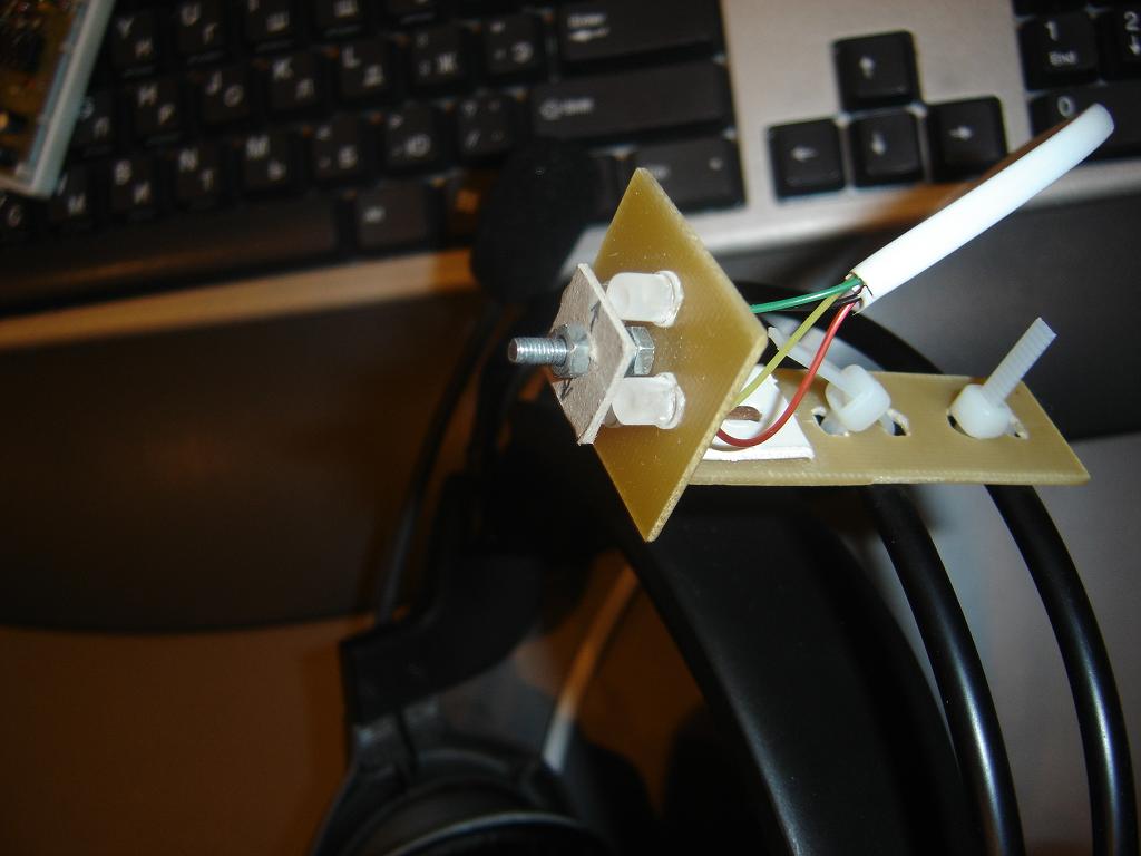 А это то, что Сендер назвал "яцами на лбу" )) Излучатель, который состоит из 4х ИК светодиодов и непрозрачной шторки. Хотя сендер в чем-то был прав. Я планирую прикрыть конструкцию излучателя половинкой яйца от киндер сюрприза :lol: