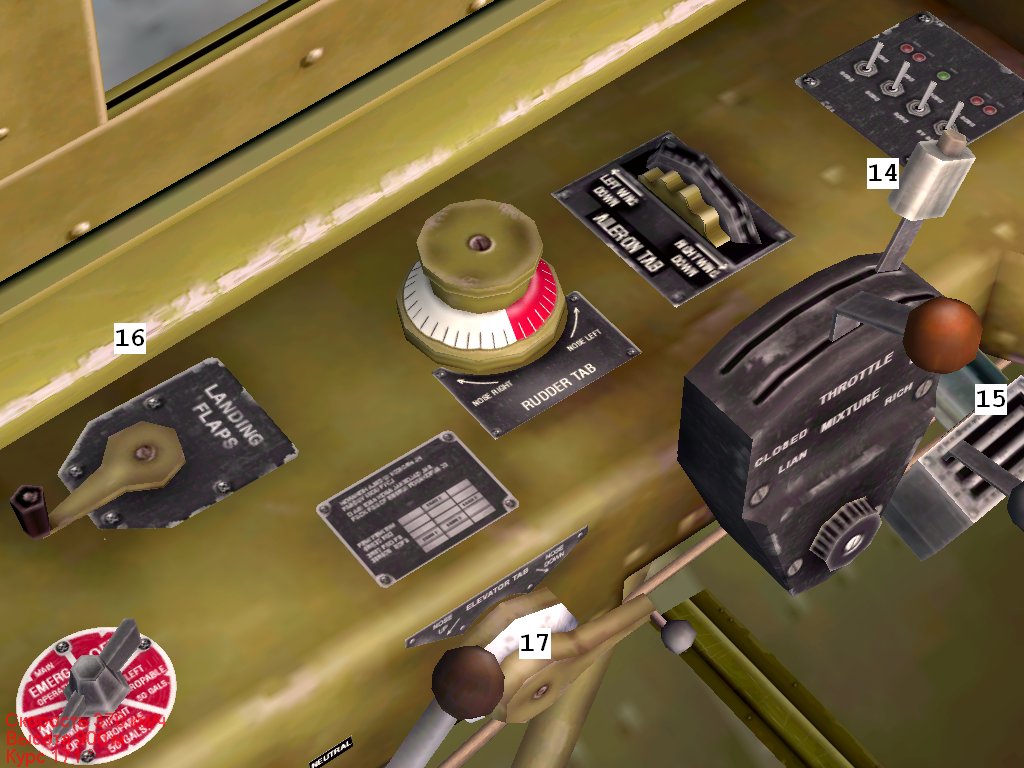 16. Ручка установки закрылок. В отклоненном назад положении закрылки убраны. При отклонении вправо закрылки будут выпускаться на различные положения