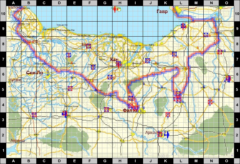 На карте смоделировано противостояние армий противников в Нормандии летом 1944г.