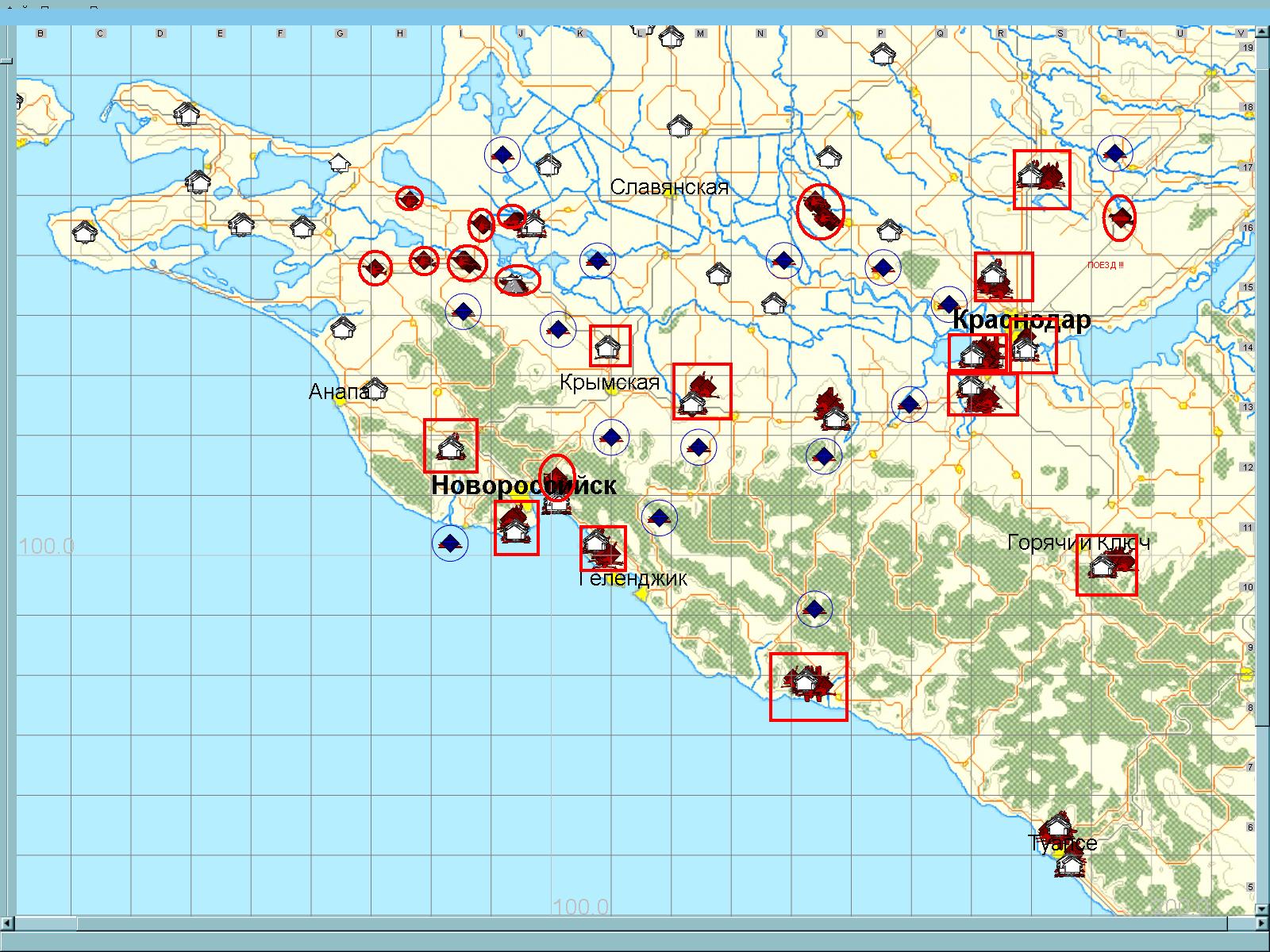 Вот карта. Кругляшки это колонны и поезд, квадратики - склады и филды =) Синим - эирстарты.