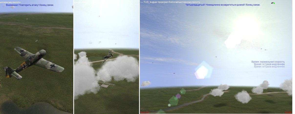 Теперь я ведущий, но я настолько подавлен, что мой ведомый (брат моего бывшего ведущего что ли?) берет бразды правления в свои крылья. Этот вылет мне запомнился не тем, что мы бросили подопечных, погнавшись за бомберами врага, а то, как я сошелся в лоб с парой истребителей Иванов. Я думал, что если и попаду во врага, то только своим истребителем – так близко мы прошли мимо!!! Оглянувшись назад, я воспел – мой оппонент кувыркался без крыла!! Я жив!!! Дальше ничего не помню, т.к. упился шнапсом. P.S. На днях обещали показать какой-то Samogon…