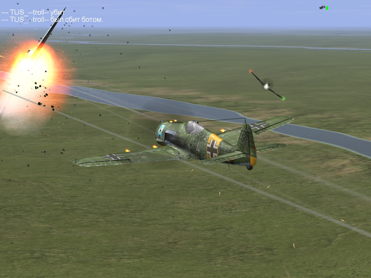 Второй вылет. Непосредственное прикрытие девяти юнкерсов выполнили образцово - почти все бомбардировщики отбомбились без помех. Но уже над самой целью сзади снизу вынырнули до десяти иванов. В горячке боя потерял ведущего. Уцепился за яком. Отогнал его от бомбардировщиков и сбил. Обернулся назад - увидел как фоккевульф 51х атакован еще одним яком. Поймал его в верхней точке, продырявил. За пару заходов основательно повредил его и стал собираться с оставшимися истребителями. Видел падение сбитого Троллом ивана. Пошел с Троллом парой домой где-то на двух с половиной. Над и13 увидели движущуюся встречным курсом пару кобр выше примерно на полторы тысячи. Потянули вверх, развернулись и стали догонять. Дошли до Тагино, догнать не получилось. Обнаружили сзади себя еще пару, которую атаковал африканец. Сделали заход на встречном курсе, разобрали с Троллом по цели и стали работать. Заметил у Тролла шесть, кричал, но иван отстрелил фоке крыло. Остался один двумя кобрами. Задымил одну. Выше слышал, как скрипел зубами африканец почти в такой же ситуации, как и моя. Хорошо, что подтянулись Коптук, Тесак и Ботсман. Оставил им дымящегося и пошел за верхними кобрами. Атаковал пару раз кобру, которую африканец своим скрежетом оглушил. Летела она как-то странно, оно и понятно, не каждый ариец выдержит такое нечеловеческое издевательство, что уж говорить об иванах. Пара заходов, выбитый радиатор, и у кобры встал двигатель. Добивать не стал, посчитал более эффективным повредить вторую кобру, пулеметами прошил ей крыло, ушел вверх и позволил африканцу сбить ее, ведь только благодаря его крепким зубам и стальным нервам я не остался один против четырех кобр.
