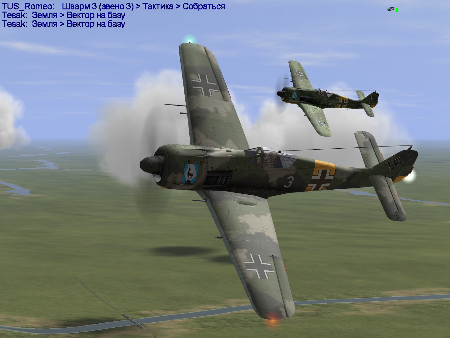 Уходим на базу. Как отработали Ю-88 не видел, зато видел 2 ихних экипажа на парашютах в районе линии фронта... и еще один уже на нашей территории в I-13, там же чуть севернее прямо под нами сел Ромео. И тут сообщают, что южнее нас кобры - разворачиваемся, идем на помощь. Сначало я подумал, что кобра всего одна, к тому же пробитая, но увидел еще одну, первую уже брали в оборот - думаю, сейчас этой гадюке не до меня, но не тут то было - хорошо вовремя Кортик предупредил(спасибо :beer: ), но всеравно, нервы пощекотала основательно... с каждым громыханием её дрына, казалось, что вот - пришла и моя очередь... но тяну на себя изо всех сил, перекрутил, Кортик уже у неё на шести.