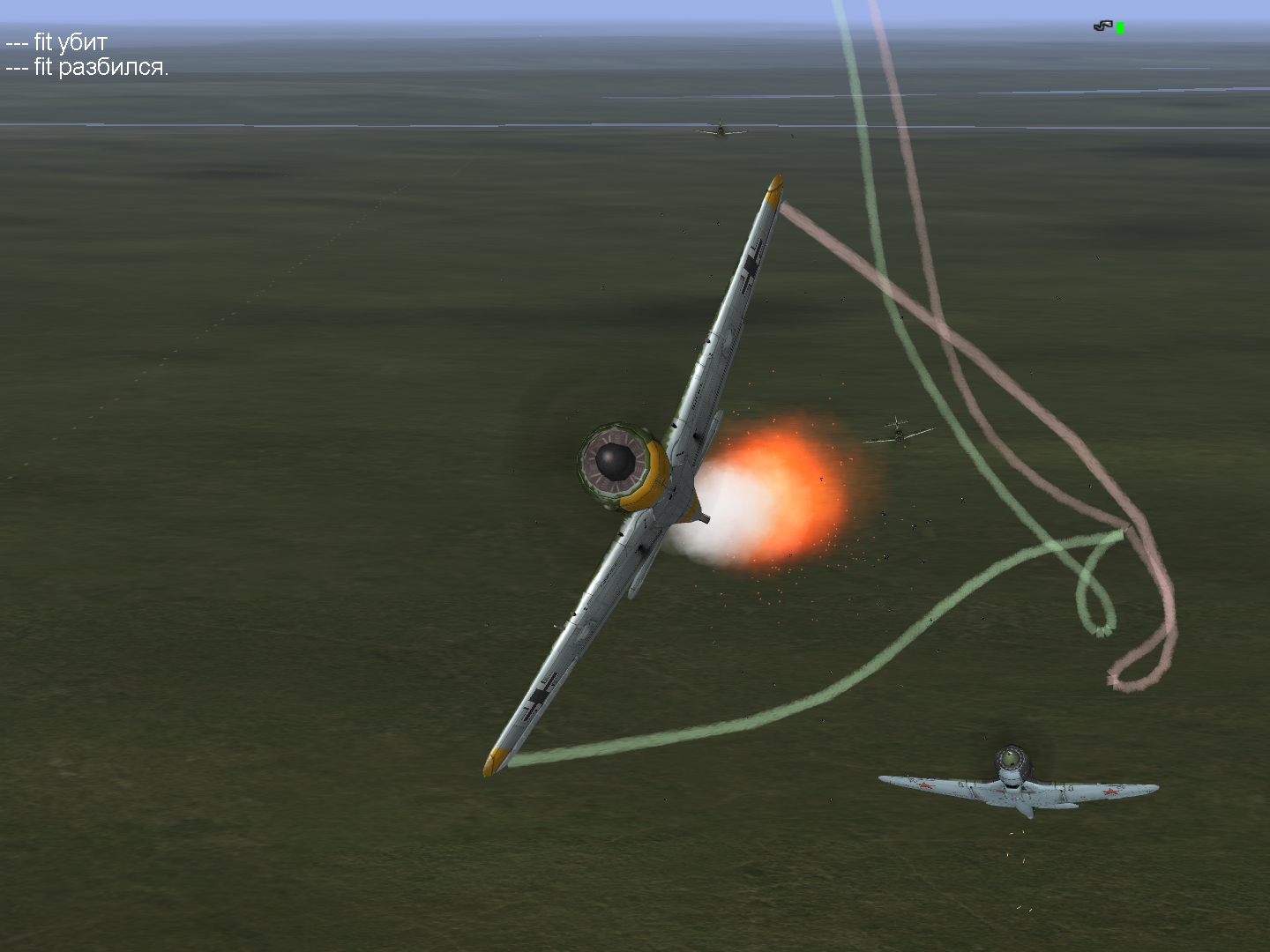 В этот раз бой был еще интенсивнее, все небо в разрывах, дымах и самолетах. Пошел на помощь Ромео, даю очередь, но все мимо, к тому же лавка сидит очень плотно, как бы обоих не сбить, надо целиться по лучше - и тока я собираюсь опять зажать гашетки, как лавка превращается в желто-оранжевый шар! Какого черта, не силой мысли же я её аннигилировавал - оборачиваюсь - фока с №2, Кекс, все понятно :)
