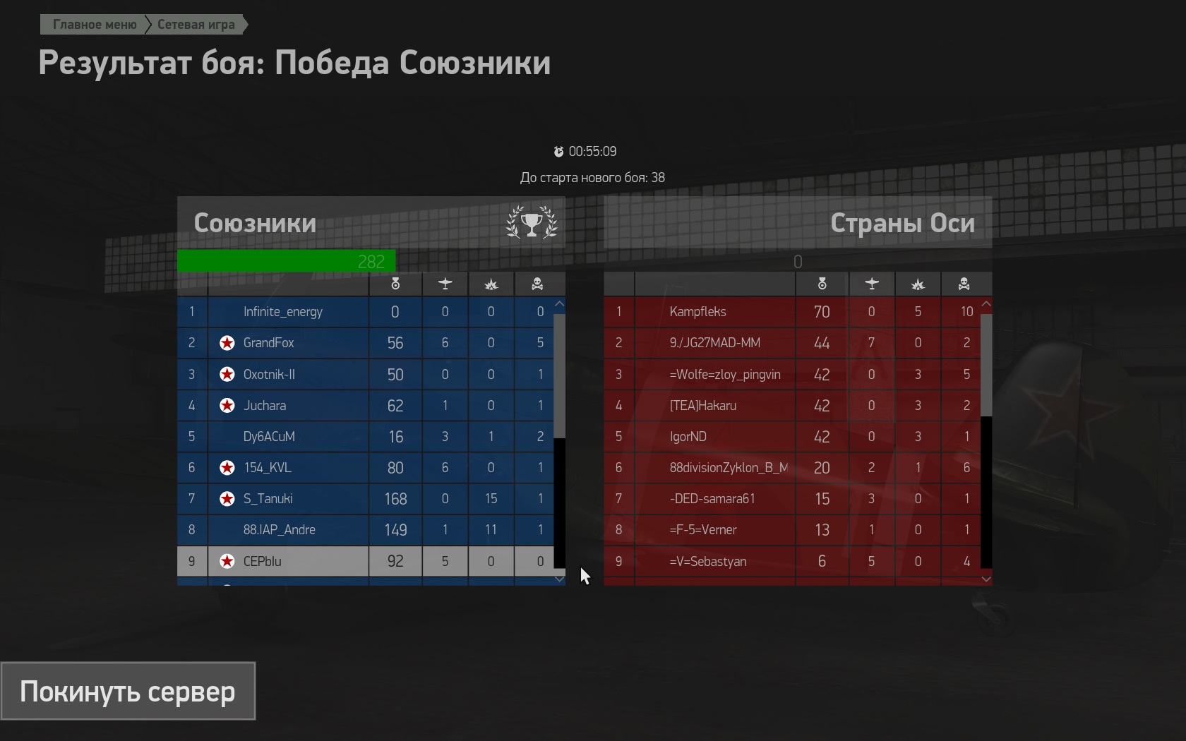 Уже начали? А то я тут уже отрываюсь на DED Normal с танками... Кстати не все так плохо с нашими самолетами сейчас в онлайне. Вылет на ЛаГГе - сбил фоку в лоб  , повредил танк, мессер отгрыз стабилизатор, посадка. Вылет на Лавке - повредил танк, 2 сбитых (месс, фока), на самолете ни царапины, посадка. Вылет на Яке - завяз в маневренном бою против толпы, 2 сбитых мерса, повредили двигло, смог уйти но не дотянул до полосы метров 100.